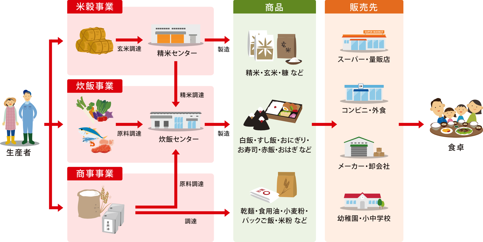 石川県で生産されたお米を主力商品として、石川県内を中心に事業展開しています。当社の精米工場では、精米がタンク毎移動する「多用途搬送システム」を全国で初めて導入し、安全で美味しい精米商品づくりに努めています。一般家庭用精米商品は石川県内でトップシェアを誇っています。その他、業務用としてコンビニや外食向けなど、お米については精米・玄米問わず様々な商品をラインナップしています。