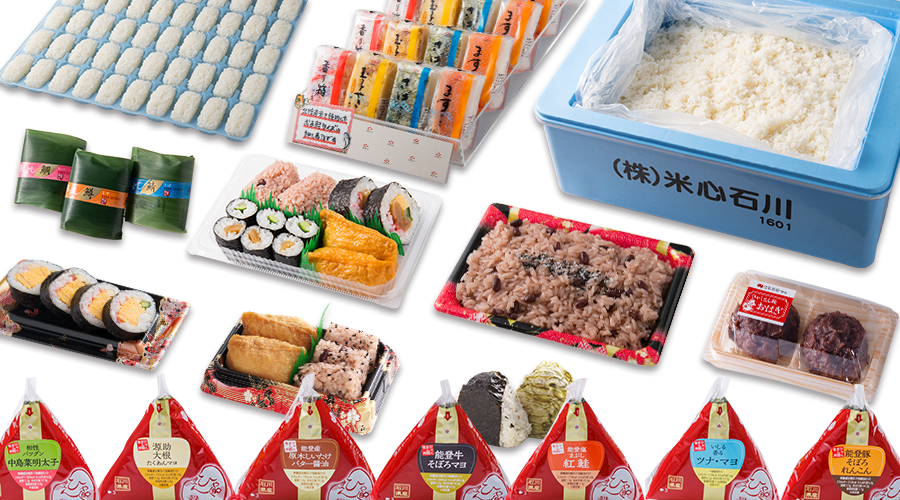 当社の精米工場で精米されたお米を使用し、炊飯工場でご飯・おにぎり・お寿司・赤飯・おはぎなどを製造しています。量販店や外食向けはもちろん、金沢市近郊の小学校・中学校向けの学校給食や幼稚園向けのお弁当も製造しております。当社の炊飯工場では、北陸初の産業用ロボットによるIH炊飯システムを導入し、高度なセキュリティー、衛生管理のもとで製造しています。