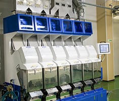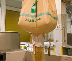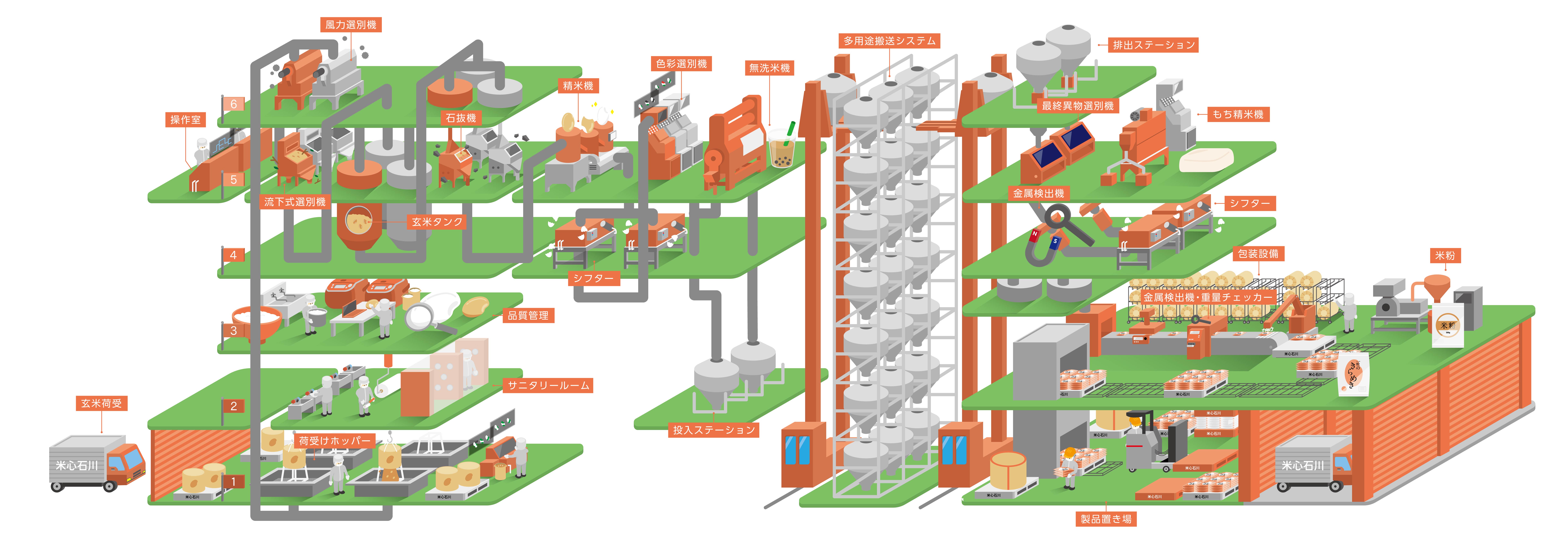 世界初の精米タンク自体を搬送する「多用途搬送システム」を導入。ベルトコンベアーなどを使う従来方法に比べて白米へのダメージを減らし、できあがった精米の品質を保持します。