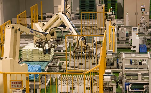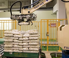 チェックされた製品をパレットへ積み、製品保管庫へ搬送します。