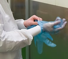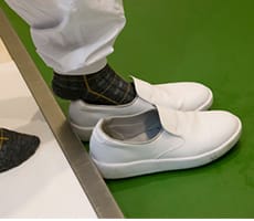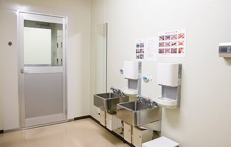 工場内をクリーン度別に衛生・準衛生・汚染区域に区別するゾーニングを採用。汚染区域から衛生区域への移動はサニタリールームを経由して入室するつくりとなっており、ローラー掛け、手洗い、エアーシャワーを通ることで、作業者や搬入物に付着した汚染物の持込みを防ぎます。