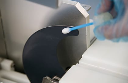 工場内を巡回する衛生監視チームを編成し、第三者の視点で、機械設備の不具合の確認や、5S(整理・整頓・清掃・清潔・躾)の取り組みへの提言など、食品安全が確実に守られるように、一歩踏み込んだ改善提案を行います。また、設備の汚染や洗浄不良を確認するふき取り検査や、製品の菌検査を行い安全な製品が作られていることを監視します。